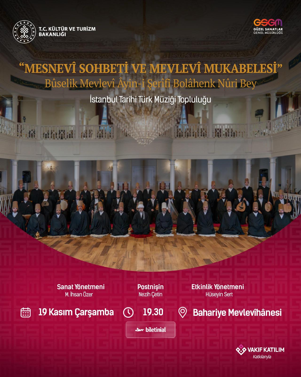 'Pergel gibiyim; bir ayağımla şeriat üstünde sağlamca durduğum halde öbür ayağımla yetmiş iki milleti dolaşıyorum.' diyen Mevlana'yı tanımak ve en çok okunan eserlerden biri olan Mesnevi'yi anlamak için T.C. Kültür ve Turizm Bakanlığı - İSTEV ortaklığında periyodik olarak her ayın üçüncü Çarşamba'sı vakıf merkezimiz Bahariye Mevlevihanesi'nde Mesnevî Sohbeti ve Mevlevî Mukabelesi programını icra etmekteyiz. Program (Mesnevi Sohbeti ve Mevlevi Mukabelesi) İstanbul Tarihi Türk Müziği Topluluğu'nca düzenlenmektedir.